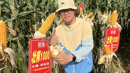 【特征特性】: 生育期春季平均120天,秋季平均107天。株型半紧凑,株高252.9cm,穗位高110.9cm,穗筒型,籽粒黄色半马齿型,果穗外观优,轴色白色,穗长16.4cm,穗粗5.2cm,穗行幅度12~18行,平均16.7行,平均行粒数33.3粒,单穗粒重146克,日产量4.5公斤,百粒重32.6克,出籽率82.6%。容重759g/L,粗蛋白9.30%,粗脂肪4.6%,粗淀粉73.09%。抗性鉴定结果:中抗纹枯病,中抗大斑病,中抗小斑病,中抗轮枝镰孢穗腐病。种植密度3000-3500株/亩。可在广西全区春、秋季种植。轮枝镰孢茎腐病高发区慎用。